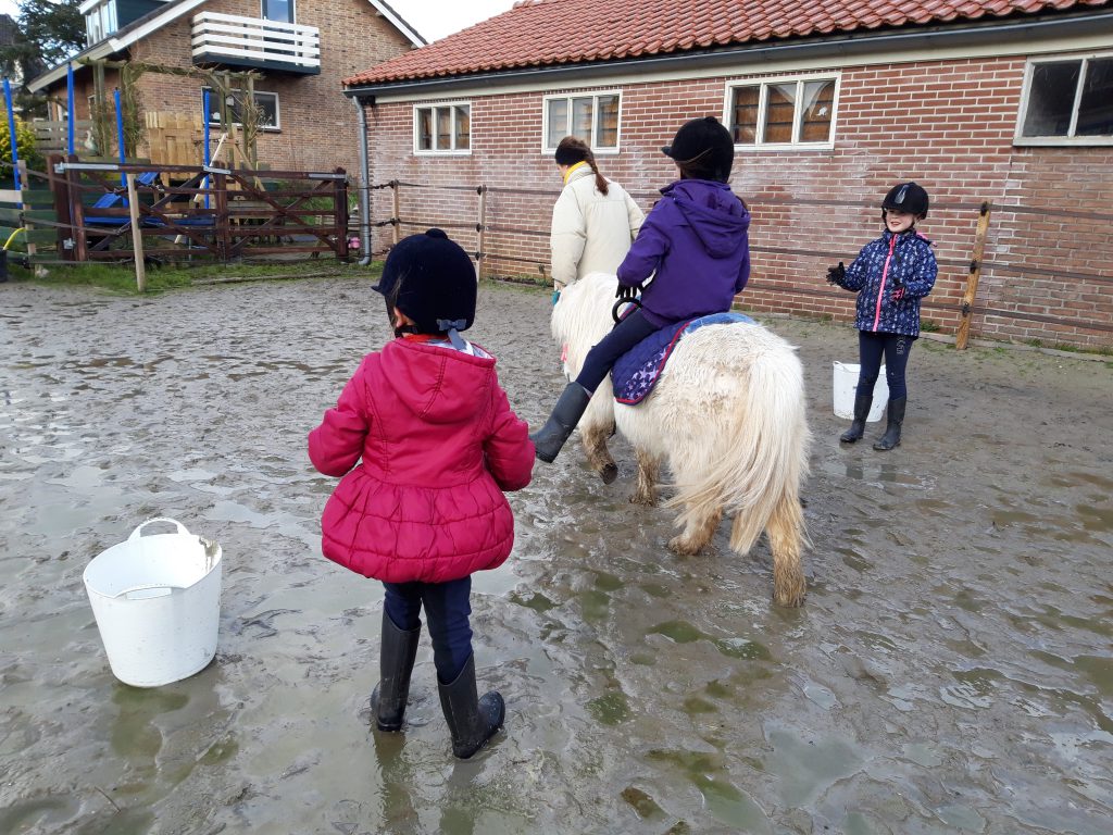 De leerlingen worden in drietallen ingedeeld en staan met een pony/de pony’s achter de pionnen.
