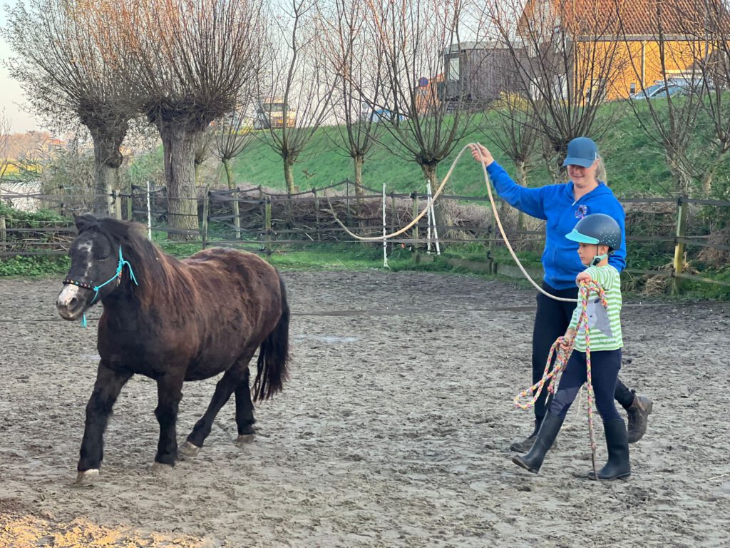 Daarom werken we vaak met z’n tweeën samen met het paard of de pony. Met rijden betekent dit bijvoorbeeld: één op het paard, één ernaast.